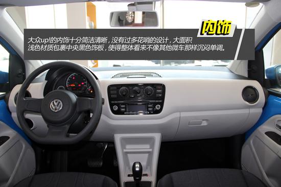 大众up!的内饰十分简洁清晰,没有过多花哨的设计,大面积浅色材质包裹中央黑色饰板,使得整体看来不像其他微车那样沉闷单调。