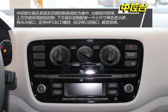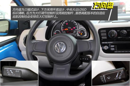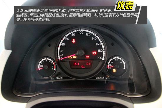 大众up!的仪表盘与甲壳虫相似,自左向右为转速表、时速表、油耗表,黑底白字搭配红色指针,显示相当清晰,中央时速表下方单色显示屏显示里程等基本信息。