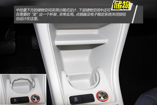 中控最下方的储物空间采用分隔式设计,下层储物空间中还可在需要时“变”出一个杯架,非常实用。点烟器及电子稳定系统关闭按钮也设计在这里。