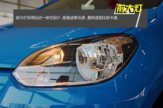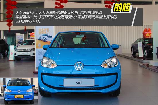 大众up!延续了大众汽车简约的设计风格,前脸与纯电动车型基本一致,只在细节之处略有变化:取消了电动车型上亮眼的LED日间行车灯。前大灯采用远近一体式设计,配备卤素光源,造型比较卡通,下方黑色的进气格栅在前保险杠上拼出一个大大的笑脸,整体造型小巧可爱,略显呆萌。