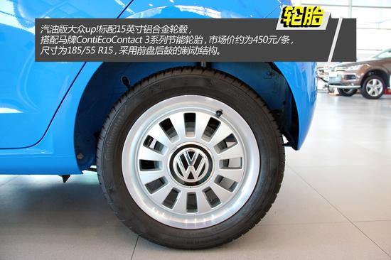 汽油版大众up!标配15英寸铝合金轮毂,搭配马牌轮胎ContiEcoContact 3系列节能轮胎,市场价约为450元/条,尺寸为185/55 R15,采用前盘后鼓的制动结构。