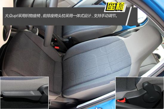 大众up!采用织物座椅,前排座椅及头枕采用一体式设计,支持手动调节。