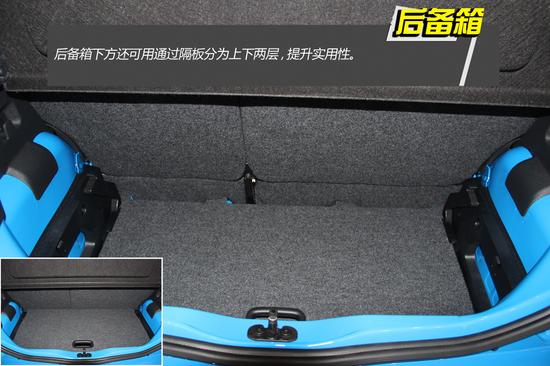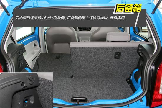 大众up!的后备箱开口非常大,内部空间在微车中也属上乘。后排座椅完全放倒后,可以获得非常宽敞的平整空间,出游装货不在话下。后排座椅还支持4:6按比例放倒,后备箱侧壁上还设有挂钩,非常实用。后备箱下方还可用通过隔板分为上下两层,提升实用性。后备箱最下方隐藏着非全尺寸备胎及工具。